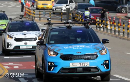 국내 한 자율자동차 주행 경연대회에서 자동차들이 주행하고 있다. 경향신문 자료사진 |