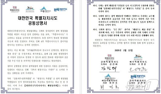 공동성명서에는 △광역 행정통합 특별법안 심사 시 ‘강원·제주·전북특별법’과 ‘행정수도 특별법’ 동시 국회 통과 △행정통합 인센티브 부여 과정에서 특별자치시도가 소외되거나 불이익 받지 않도록 국회와 정부의 입법 및 정책 의지 표명 요구 △모든 특별자치 지역에 대해 공평한 기회와 투명한 원칙에 기반한 국가 자원 배분 실행 요구 등의 내용이 담겼다.