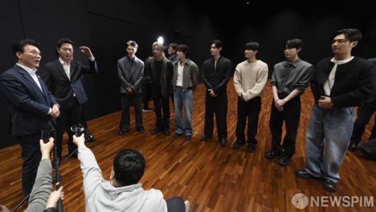 [서울=뉴스핌] 청사사진기자단 = 김민석 국무총리가 21일 오후 서울 용산구 하이브 사옥 안무연습실을 방문해 보이그룹 엔하이픈과 대화를 나누고 있다. 2026.01.21 photo@newspim.com |