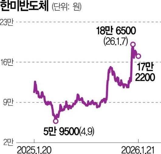 21일 금융투자 업계에 따르면 리딩투자증권은 최근 한미반도체의 목표주가를 기존 13만 원에서 24만 원으로 84% 상향 조정했다. 현재 주가 17만 2200원 기준으로도 추가 상승 여력이 40%가량 남아 있는 셈이다.