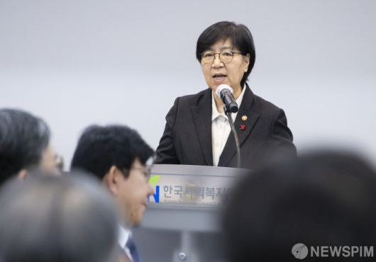 [서울=뉴스핌] 정은경 보건복지부 장관이 21일 오전 서울 마포구 한국사회복지협의회에서 열린 2026년 사회복지계 신년인사회에서 인사말을 하고 있다. [사진=보건복지부] 2026.01.21 photo@newspim.com