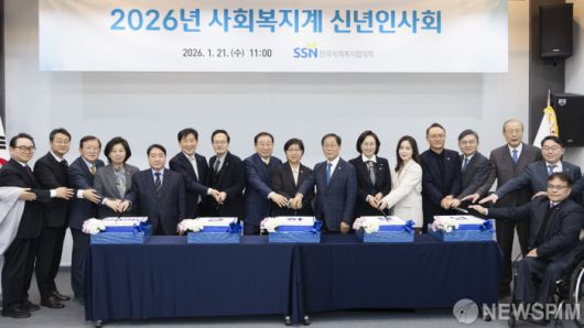 [서울=뉴스핌] 정은경 보건복지부 장관을 비롯한 참석자들이 21일 오전 서울 마포구 한국사회복지협의회에서 열린 2026년 사회복지계 신년인사회에서 떡케이크 절단식을 하고 있다. [사진=보건복지부] 2026.01.21 photo@newspim.com