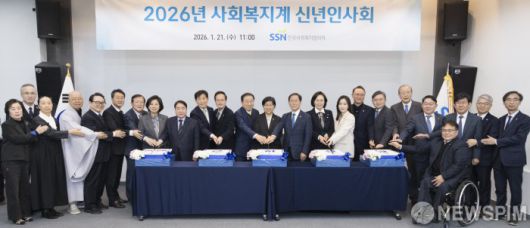 [서울=뉴스핌] 정은경 보건복지부 장관을 비롯한 참석자들이 21일 오전 서울 마포구 한국사회복지협의회에서 열린 2026년 사회복지계 신년인사회에서 떡케이크 절단식을 하고 있다. [사진=보건복지부] 2026.01.21 photo@newspim.com