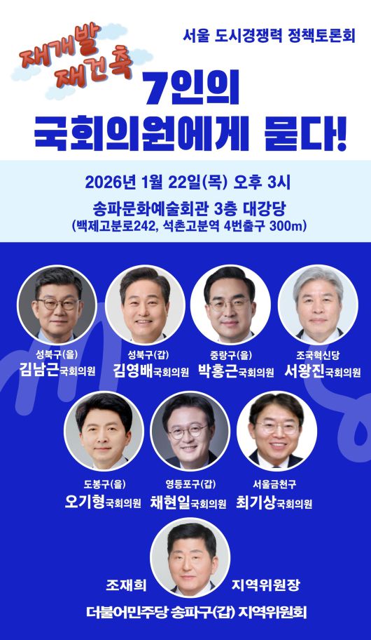 ‘재개발·재건축, 7인의 국회의원에게 묻다’를 주제로 한 이번 토론회는 1월 22일 오후 3시 송파문화예술회관 3층 대강당에서 개최된다.