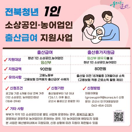 신청 자격은 공고일 기준 6개월 이상 전라북도에 거주하고 주민등록상 주소지가 군산시이며, 전북도 내에서 사업장을 운영 중인 1인 소상공인 또는 농어업인으로, 2026년 1월 1일 이후 출산한 경우에 해당한다. 또한 자녀의 출생신고를 군산시 관내 주소로 완료해야 한다.