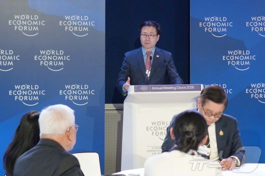(서울=뉴스1) = 여한구 산업통상부 통상교섭본부장이 20일(현지시간) 스위스 다보스에서 열린 '2026 세계경제포럼 연차회의'에서 발언을 하고 있다.(산업통상부 제공. 재판매 및 DB 금지) 2026.1.21/뉴스1