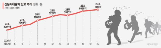 신용거래융자 잔고는 투자자가 증권사에서 자금을 빌려 주식을 매수한 뒤 상환하지 않은 금액으로, 개인 투자자의 '빚투' 규모를 가늠할 수 있는 지표다. 6개월 전인 지난해 8월만 해도 신용거래융자 잔고는 21조원대 수준이었지만, 증시 호황으로 꾸준히 늘어났다. 지난해 12월 5일 처음으로 27조원대를 기록했고, 1개월여만인 이달 8일 28조원을 돌파한 데 이어 10여일 만에 29조원을 넘어선 것이다.