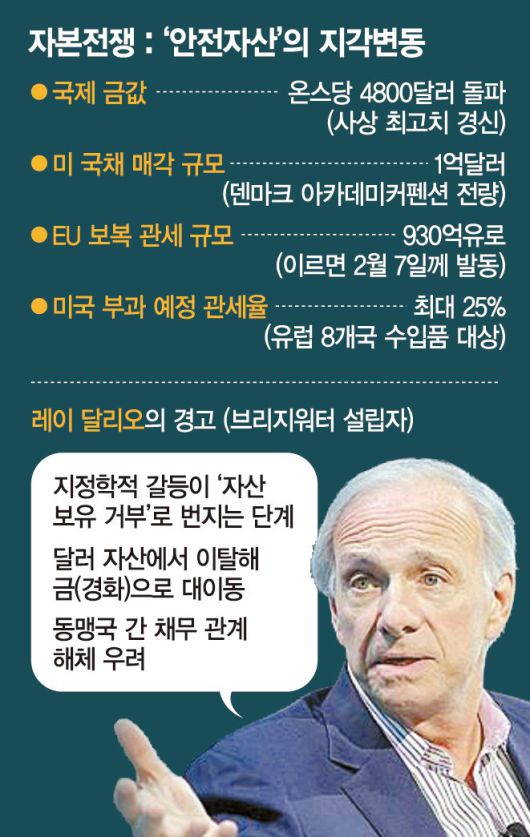 지정학적 위기가 고조되자 세계 최대 헤지펀드 브리지워터 어소시에이츠의 창업자 레이 달리오도 입을 열었다. 그는 같은 날 스위스 다보스에서 열린 세계경제포럼(WEF) 인터뷰에서 현재의 상황을 '자본 전쟁'의 국면으로 규정했다. 달리오는 "무역 적자와 무역 전쟁의 이면에는 항상 자본 전쟁이 있다"며 "미국의 일방적인 공세가 외국 정부와 투자자들의 미국 자산 보유를 근본적으로 재검토하게 만들 것"이라고 경고했다.