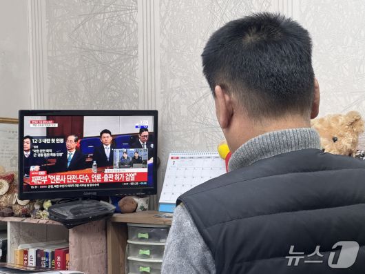 21일 울산 중구 성남동 중앙전통시장의 한 점포에서 시민이 한덕수 전 국무총리에 대한 1심 선고 재판 TV 생중계를 보고 있다. 2026.1.21/뉴스1 ⓒ News1 김세은 기자 |