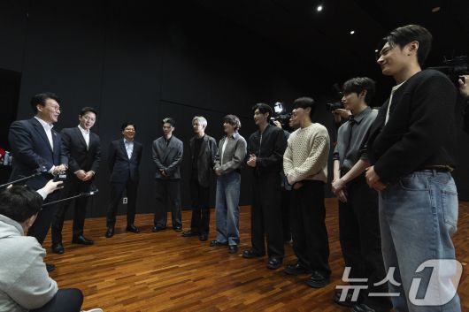 (서울=뉴스1) 청사사진기자단 = 김민석 국무총리가 21일 오후 문화컨텐츠 현장방문의 일정으로 용산구 하이브를 방문 KPOP 보이그룹 엔하이픈 안무연습실에서 대화를 나누고 있다. 2026.1.21/뉴스1