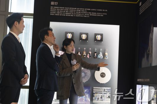 (서울=뉴스1) 청사사진기자단 = 김민석 국무총리가 21일 오후 문화컨텐츠 현장방문의 일정으로 용산구 하이브를 방문해 하이브 이재상 대표이사(왼쪽 끝)와 홍보부스에서 설명을 듣고 있다. 2026.1.21/뉴스1seiyu@news1.krCopyright ⓒ 뉴스1. All rights reserved. 무단 전재 및 재배포, AI학습 이용 금지.