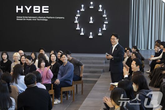(서울=뉴스1) 청사사진기자단 = 김민석 국무총리가 21일 오후 문화컨텐츠 현장방문의 일정으로 용산구 하이브를 방문 청년종사자 타운홀 미팅을 하고 있다. 2026.1.21/뉴스1