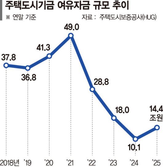 HUG에 따르면 여유자금 규모는 지난 2018년 말 37조8000억원에서 2021년에는 49조원으로 역대 최고치를 기록했다. 이후 2022년 28조8000억원으로 반토막 수준으로 추락했고, 2023년 18조원에서 2024년에는 10조1000억원까지 하락했다. 업계에서는 지난해 말 기준으로 10조원대도 붕괴될 수 있다는 최악의 우려가 나왔으나 소폭 반등에 성공한 것이다.