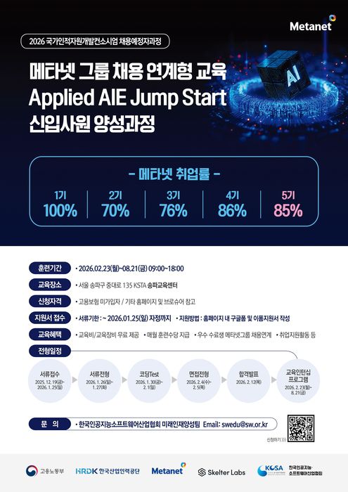 한국인공지능·소프트웨어산업협회(KOSA)가 '메타넷그룹 채용연계형 신입사원 양성과정' 교육생을 오는 25일까지 모집한다.