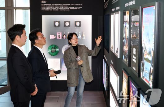 (서울=뉴스1) 청사사진기자단,임세영 기자 = 김민석 국무총리가 21일 오후 서울 용산구 하이브 사옥을 방문해 관계자의 설명을 들으며 홍보물을 살펴보고 있다. 2026.1.21/뉴스1seiyu@news1.krCopyright ⓒ 뉴스1. All rights reserved. 무단 전재 및 재배포, AI학습 이용 금지.