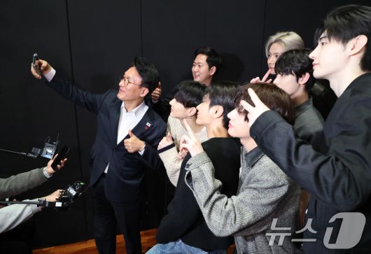 (서울=뉴스1) 청사사진기자단 = 김민석 국무총리가 21일 오후 서울 용산구 하이브 사옥 안무연습실을 방문해 보이그룹 엔하이픈과 셀카를 찍고 있다. 2026.1.21/뉴스1seiyu@news1.krCopyright ⓒ 뉴스1. All rights reserved. 무단 전재 및 재배포, AI학습 이용 금지.