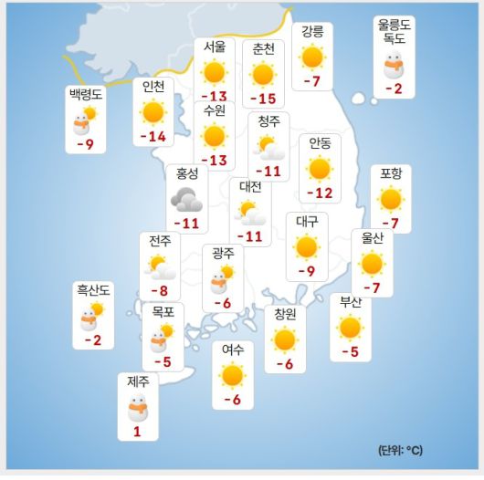 전국 주요 도시별 예상 최저기온은 △서울 -13도 △인천 -14도 △춘천 -15도 △강릉 -7도 △대전 -11도 △대구 -9도 △전주 -8도 △광주 -6도 △부산 -5도 △제주 1도 △울릉도 독도 -2도다.