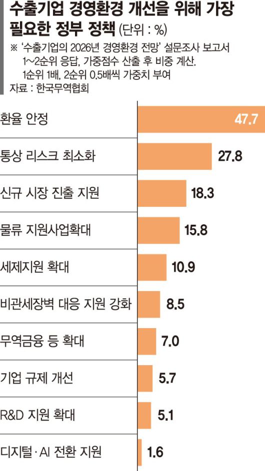 이에 경영환경 개선을 위한 최우선 정부 정책으로는 '환율 안정(47.7%)'이 압도적인 1순위를 차지했으며, '주요국과의 협상을 통한 통상 리스크 최소화(27.8%)'가 뒤를 이었다. 무역협회는 "조사 대상 15개 전 품목군에서 모두 환율 안정을 1순위 정책으로 꼽았다"며 "업종 불문하고 환율 변동성 대응이 절실한 상황"이라고 설명했다.