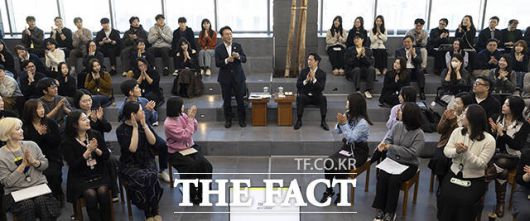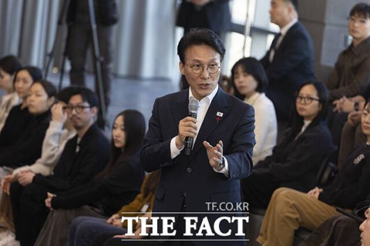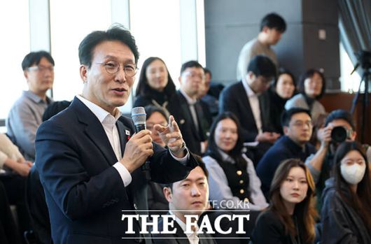 [더팩트ㅣ임영무 기자] 김민석 국무총리가 21일 오후 서울 용산구 하이브 사옥에서 열린 청년 종사자 타운홀 미팅에 참석해 인사말을 하고 있다.