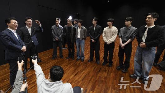 (서울=뉴스1) 청사사진기자단 = 김민석 국무총리가 21일 오후 문화컨텐츠 현장방문의 일정으로 용산구 하이브를 방문 KPOP 보이그룹 엔하이픈 안무연습실에서 대화를 나누고 있다. 2026.1.21/뉴스1seiyu@news1.krCopyright ⓒ 뉴스1. All rights reserved. 무단 전재 및 재배포, AI학습 이용 금지.