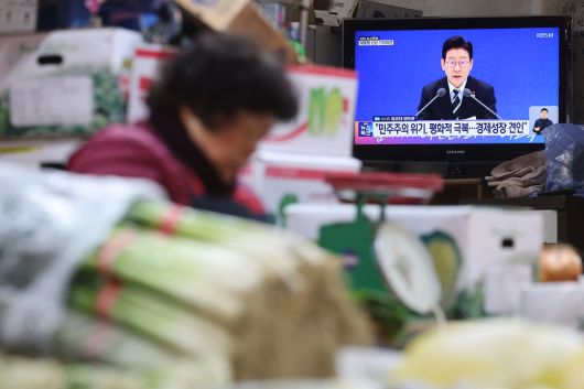 21일 서울 인왕시장 한 가게의 TV에 이재명 대통령 신년 기자회견 방송이 나오고 있다. 연합뉴스 |