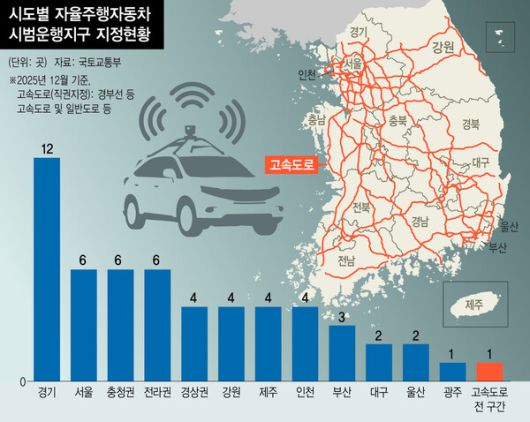 지방정부가 자체적으로 자율주행차를 시범 운행하기도 한다. 서울시의 ‘심야 자율주행 택시’가 대표적이다. 시는 강남 지역에 한정해 2024년 9월26일부터 이 택시를 운행해왔다. 지난해 11월 말 기준 1년여 넘는 기간 누적 탑승 건수는 6343건, 누적 운행 거리는 3만km다. 시는 무료로 시범 운영해 온 자율주행 택시를 이르면 다음달 안에 유료로 전환할 예정이다. 마을버스 형태의 자율주행차는 지난해 7월 동작구에서 운행을 시작했고, 같은 해 10월부터 운행 지역을 동대문구·서대문구로 확대했다.