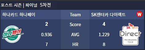 반면 하나카드는 다 잡았던 우승을 다음으로 미뤄야 했다. 출발은 완벽했다. 1세트에서 그동안 4전 전패를 당했던 초클루-Q.응우옌 조가 레펀스-응오딘나이 조를 11:9(7이닝)로 꺾으며 징크스를 탈출했다. 이어 2세트에서도 김가영-사카이 아야코가 9:6으로 승리하며 우승까지 단 2세트만을 남겨뒀었다. 하지만 3세트부터 시작된 SK렌터카의 오더 변화에 적응하지 못하고 내리 4세트를 헌납, 아쉬움을 삼켰다.