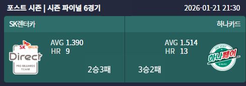 21일 오후 3시 경기도 고양 킨텍스 PBA 스타디움에서 열린 '웰컴저축은행 PBA 팀리그 2025-2026' 파이널 5차전에서 SK렌터카는 하나카드를 세트스코어 4:2로 제압했다.