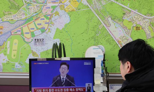 주택시장도 李 입에 주목 이재명 대통령이 21일 신년 기자회견에서 서울 등 수도권 집값 안정화 방안에 대해 설명하고 있는 방송을 서울 서초구 한 부동산 중개업소 관계자가 지켜보고 있다. 연합뉴스 |