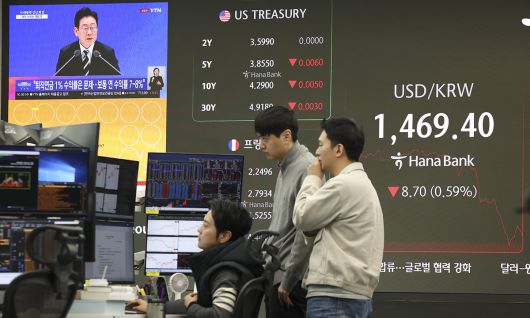 외환시장도 李 입에 주목 21일 서울 중구 하나은행 딜링룸 전광판에 표시된 원·달러 환율(1469.4원). 뉴시스