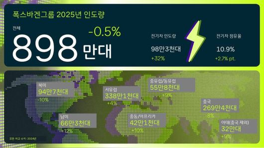 폭스바겐그룹의 2025년 전 세계 전기차 인도량은 98만3100대로, 전년(74만4600대) 대비 32.0% 증가했다. 전체 인도량에서 BEV 비중도 8.2%에서 10.9%로 확대됐다.