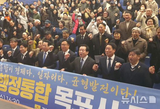 [목포=뉴시스]박상수 기자 = 21일 오후 목포시민문화체육센터에서 열린 '광주·전남 행정·교육통합 공청회'가 끝난뒤 김영록 전남도지사와 김대중 전남도교육감, 조석훈 목포시장 권한대행, 시민 등이 기념촬영을 하고 있다. 2026.01.21, parkss@newsis.com |