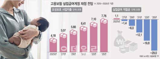 [세종=이데일리 서대웅 조민정 기자] 출산휴가·육아휴직급여 등 모성보호 사업에 들어가는 돈이 2035년 7조 7000억원에 달할 것으로 예측됐다. 수당 재원인 실업급여가 내년 고갈되고 2035년 누적 부족액은 29조원에 이를 것으로 전망됨에 따라 모성보호 사업을 고용보험이 아닌 정부 일반회계로 전환해야 한다는 데 노사가 뜻을 모았다.