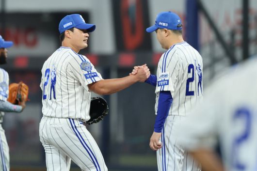 삼성 오승환이 30일 대구삼성라이온즈파크에서 열린 2025 KBO리그 KIA전에서 9회초 올라와 최형우를 삼진 처리한 후 최형우와 인사하고 있다. 사진 | 삼성 라이온즈 |