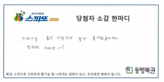 A씨는 "믿기지 않아 30분간 당첨 여부를 계속 확인했다"며 "최근 길거리 쓰레기를 줍는 등 착한 일을 실천하기 시작했는데, 그 덕분에 행운이 찾아온 것 같아 기쁘고 뿌듯하다. 쓰레기를 줍기 시작하고 복이 들어온 것 같다. 모두 착하게 살면 좋겠다"고 소감을 밝혔다.