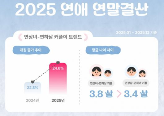 지난해 연애 트렌드에서 여성 연상과 남성 연하의 매칭 비율이 전년 대비 상승세를 보이며 '연상녀-연하남' 구도가 약진했다는 분석이 나왔다.