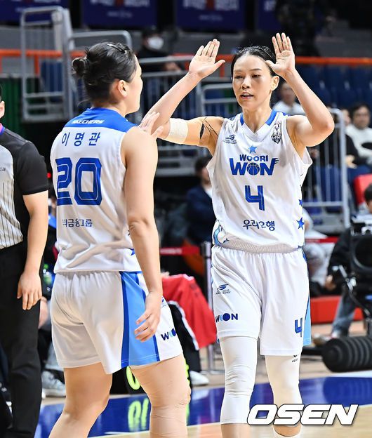 아산 우리은행 김예진이 골을 성공시킨 이명관과 하이파이브를 하고 있다. 2026.01.21 / foto0307@osen.co.kr