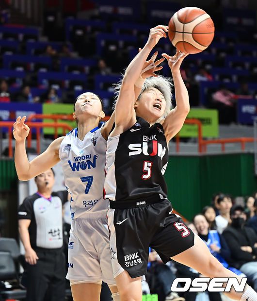 아산 우리은행 이민지와 부산 BNK 안혜지가 리바운드볼을 다투고 있다. 2026.01.21 / foto0307@osen.co.kr
