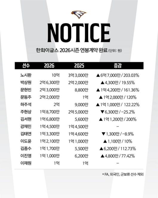 [서울=뉴시스] 프로야구 한화 이글스 2026시즌 연봉. (사진=한화 이글스 제공) 2026.01.21. *재판매 및 DB 금지 |
