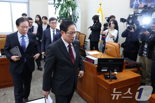 정태호 더불어민주당 간사와 박수영 국민의힘 간사가 지난 19일 서울 여의도 국회에서 열린 재정경제기획위원회가 정회된 후 회의실을 나서고 있다. 2026.1.19/뉴스1 ⓒ News1 신웅수 기자 |