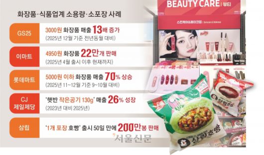 3000원짜리 화장품부터 낱개 포장 호빵까지, 고물가와 1인 가구 증가가 맞물리면서 유통업계에 ‘작을수록 좋다’는 새 공식이 등장했다. 용량과 가격을 획기적으로 낮춘 ‘미니’ 제품들이 경기 불황 속 소비자들의 지갑을 열고 있다.