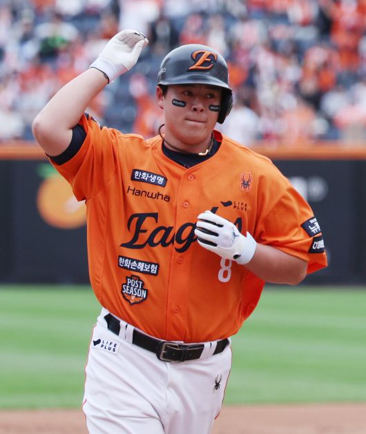 19일 대전 중구 한화생명볼파크에서 열린 2025 KBO 포스트시즌 플레이오프 2차전 삼성 라이온즈와 한화 이글스의 경기, 9회말 한화 노시환이 솔로 홈런을 친 뒤 그라운드를 돌고 있다. 2025.10.19 [대전=뉴시스]