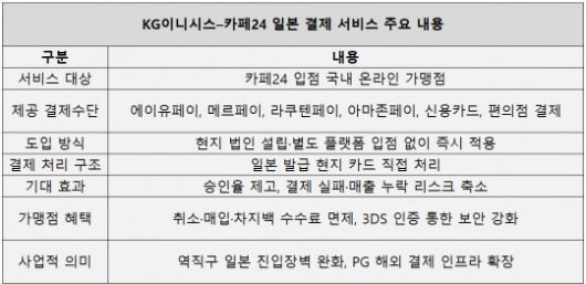 KG이니시스는 카페24를 통해 일본 진출을 추진하는 국내 온라인 사업자를 신규 가맹점으로 확보할 수 있는 채널을 넓혔다. 일본 현지 결제 수단을 일괄 제공함으로써 초기 인프라 구축 장벽을 낮추고, 결제 물량 확대를 통해 해외 거래 기반을 강화하는 전략이다.