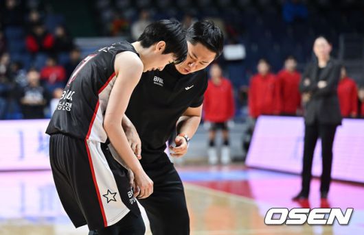 [OSEN=부산, 이석우 기자] 21일 부산 사직실내체육관에서 BNK금융 2025~2026 여자프로농구 부산 BNK와 아산 우리은행의 경기가 열렸다. BNK는 최근 8일간 4경기와 주말 백투백, 2차 연장 혈투까지 치르며 체력 부담이 큰 상황 속에서 우리은행과 3위 자리를 놓고 맞붙는다. 부산 BNK 박혜진이 손에 통증을 호소하고 있다. 2026.01.21 / foto0307@osen.co.kr