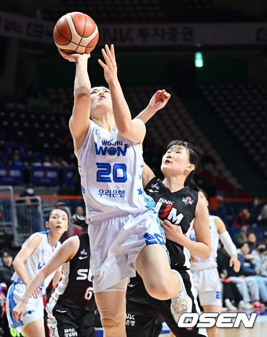 아산 우리은행 이명관이 부산 BNK 이원정의 마크를 피해 골밑슛을 시도하고 있다. 2026.01.21 / foto0307@osen.co.kr