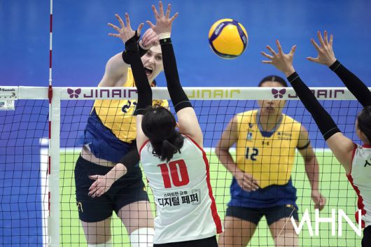 (MHN 수원, 박태성 기자) 21일 수원실내체육관에서 '2025-2026 V-리그 여자부' 현대건설과 페퍼저축은행 경기가 열렸다. 현대건설이 2위(14승9패)로 6위(8승15패)인 페퍼저축은행을 상대로 먼저 1세트를 가져가며 경기를 펼치고 있다. 카리가 경기를 펼치고 있다. <저작권자 Copyright ⓒ MHN / 엠에이치앤 무단전재 및 재배포 금지>