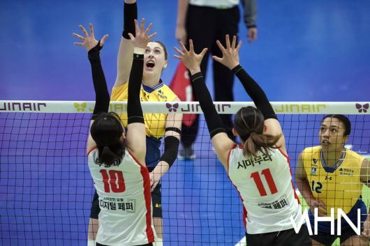 (MHN 수원, 박태성 기자) 21일 수원실내체육관에서 '2025-2026 V-리그 여자부' 현대건설과 페퍼저축은행 경기가 열렸다. 2위(14승9패) 현대건설과 6위(8승15패) 페퍼저축은행이 1-1로 경기를 펼치고 있다. 현대건설 카리가 경기를 펼치고 있다. <저작권자 Copyright ⓒ MHN / 엠에이치앤 무단전재 및 재배포 금지>