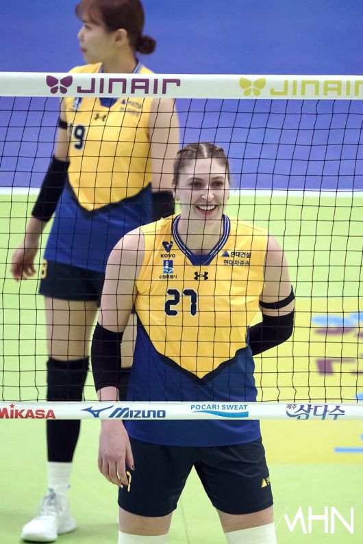 (MHN 수원, 박태성 기자) 21일 수원실내체육관에서 '2025-2026 V-리그 여자부' 현대건설과 페퍼저축은행 경기가 열렸다. 2위(14승9패) 현대건설과 6위(8승15패) 페퍼저축은행이 1-1로 경기를 펼치고 있다. 현대건설 카리가 경기를 펼치고 있다. <저작권자 Copyright ⓒ MHN / 엠에이치앤 무단전재 및 재배포 금지>
