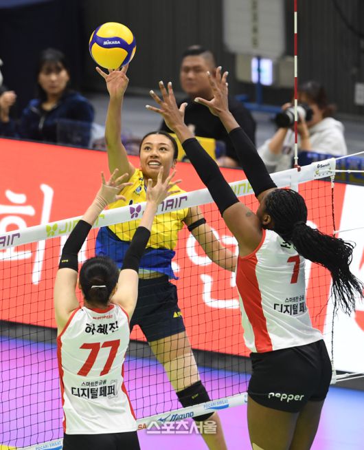 현대건설 자스티스(가운데)가 21일 수원체육관에서 열린 2025-2026 V리그 여자부 페퍼저축은행과의 경기에서 페인트 공격을 하고 있다, 2026. 1. 21.수원 | 박진업 기자 upandup@sportsseoul.com [기사제보 news@sportsseoul.com] Copyright ⓒ 스포츠서울&sportsseoul.com