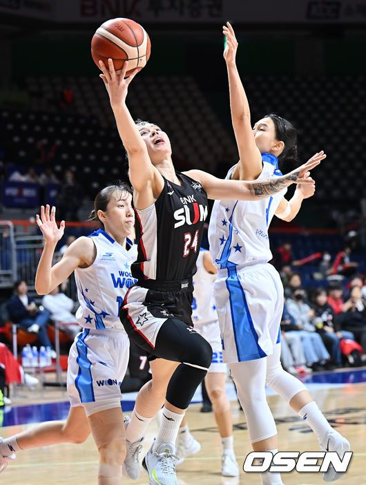 부산 BNK 김소니아가 아산 우리은행 김예진의 마크를 피해 골밑슛을 시도하고 있다. 2026.01.21 / foto0307@osen.co.kr